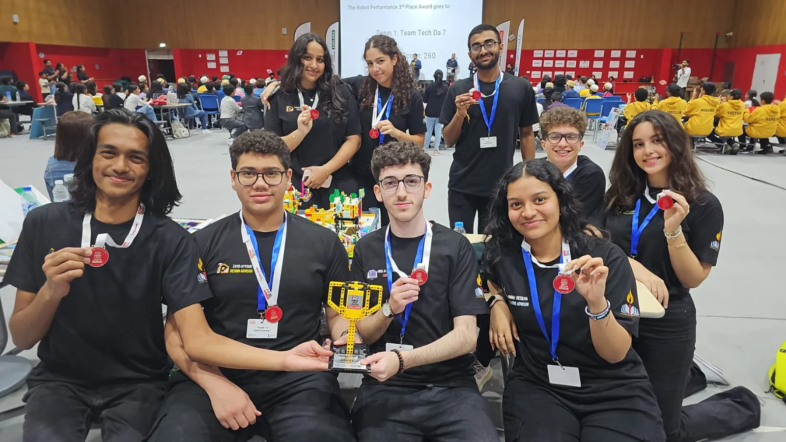 Congratulations to students enrolled in our robotics course at Nibras International school. These High School students received the runners-up prize for the Best Robot award at the First Lego League Competition held at Royal Grammar School Guildford, Dubai.Competing with other high school students from international schools in Dubai, our students created a robot that was inspired by the theme of “Masterpiece”. Our students showcased their creativity using the LEGO Spike Prime hardware and software in order to create this robot. Their goal was to design and build an all-purpose yet sturdy robot to complete several competition missions in minimal time.The robot had USB ports to connect to the sensors and motors for the wheels. The design allowed the user to quickly attach and detach robot arms, gears, forklifter, Cruze blade, and other components to accomplish various challenges in the competition. It was an autonomous robot that displayed messages of code numbers on its light matrix panel and used color sensors to help make decisions.